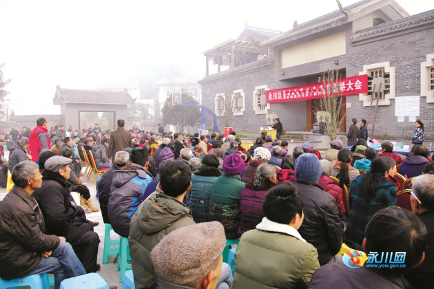 早上8时不到,朱沱镇江永村江永小学就开始热闹了起来,越来越多的手握选民证的选民,向学校操场上聚拢,有的站在展板前,详读上面的代表候选人情况介绍,有的认真听投票站工作人员讲解有关选举事项……4个镶嵌着国徽的红色票箱端放在操场前排,不远处印有换届纪律“九严禁”、“四选八不选”内容的桁架喷绘格外醒目。8点30分,草湾村、桷匠湾、柏香林、朱湾林4个村民小组方阵座无虚席。