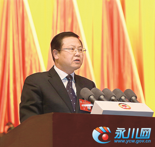 刘祥全代表政协重庆市永川区第十五届委员会常务委员会向大会作工作报告。 记者 范 辉 摄